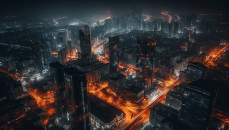 An aerial view of a modern city at night, showcasing a dense network of skyscrapers illuminated by bright streetlights, creating a striking contrast against the dark sky.