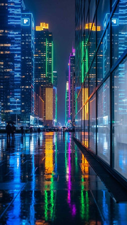 Night starry sky above Shanghai Skyscrapers. reflection of Shanghais skyscrapers amidst bustling urban life at evening.