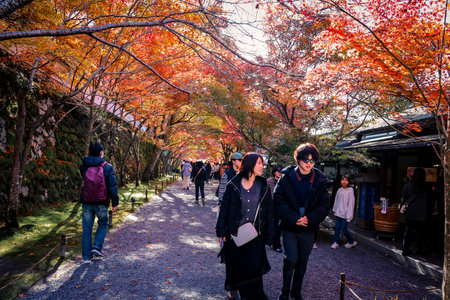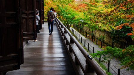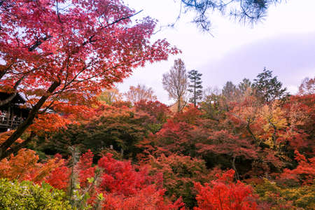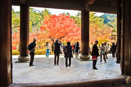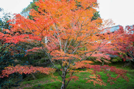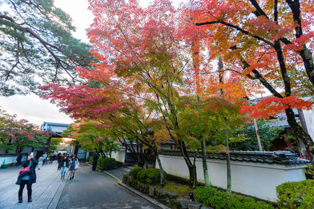 Kyoto, Japan - December 1, 2019: Colorful maple leaves in autumn at Eikando (Zenrinji) Temple. The temple has a variety of buildings and a pond garden that very famous for its autumn colors.