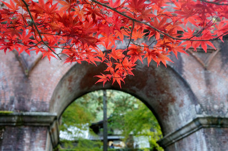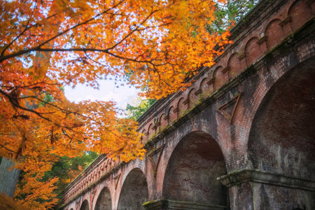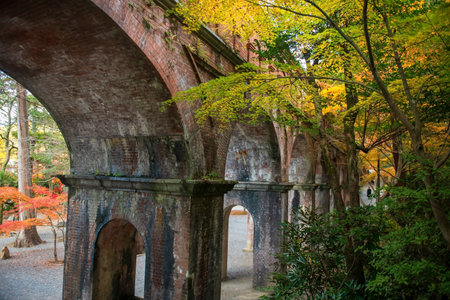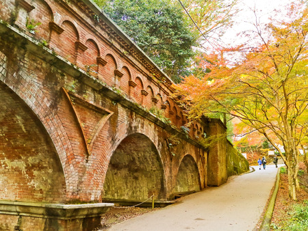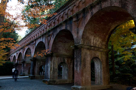 Nanzenji or Nanzen-ji Temple brick aqueduct architecture with yellow maple leaf of autumn foliage color, Kyoto, Japan. Famous travel destination for sightseeing Kansai in fall season.
