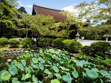 Otsu, Japan - August 21, 2018: Lotus flowers blooming on the grounds of Miidera temple