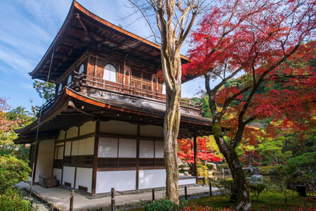 Wooden Silver Pavilion of Ginkakuji temple with colorful autumn garden against blue sky, Kyoto, Japan. Travel destination for tourist sightseeing of Kansai in fall season.
