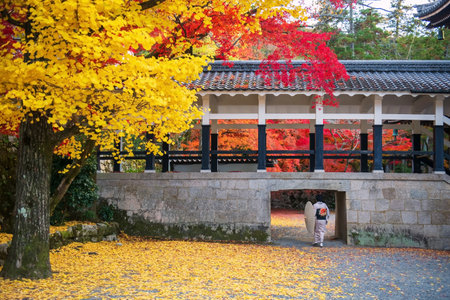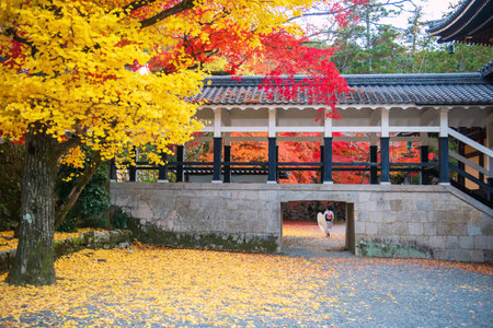 Japanese woman in kimono walk through tunnel with autumn yellow ginkgo and maple leaf at Nanzenji Temple, Kyoto, Japan. Famous travel destination for tourist sightseeing Kansai in fall