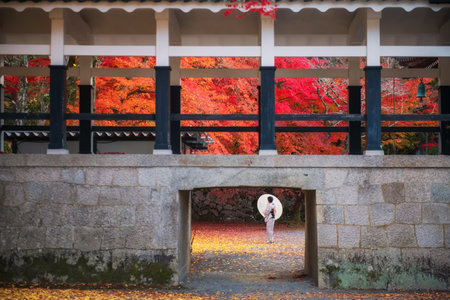Woman in traditional kimono and umbrella from footpath tunnel with maple autumn leaf at Temple, Kyoto, Japan. travel destination for tourist sightseeing Kansai in fall