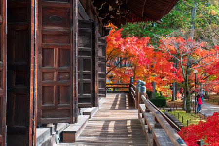 Shinnyo-do temple hall with wooden terrace and doors by vibrant autumn foliage color, Kyoto, Japan. Famous travel destination for tourist sightseeing Kansai in fall season.