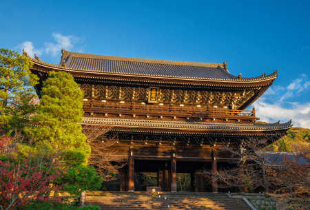 The majestic Sanmon Gate of Nanzenji Temple in Kyoto, Japan, bathed in winter sunlight. Traditional wooden architecture with intricate details, surrounded by bare trees. Kyoto, Japan.