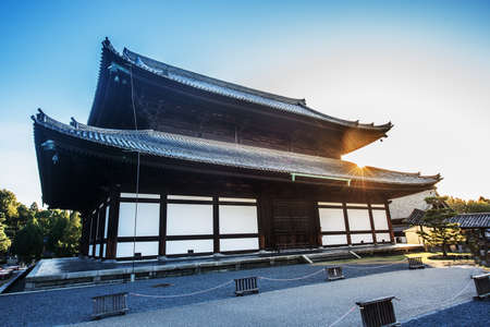 Walking wooden route of Kenninji temple hall by autumn foliage garden, Kyoto, Japan. Famous travel destination to sightseeing Kansai in fall season.