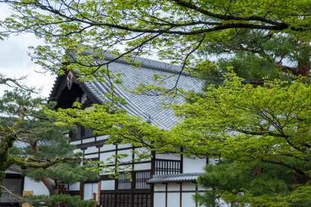 Japanese traditional building and maple tree fresh leaves, cloudy sky. Spring season in Japan