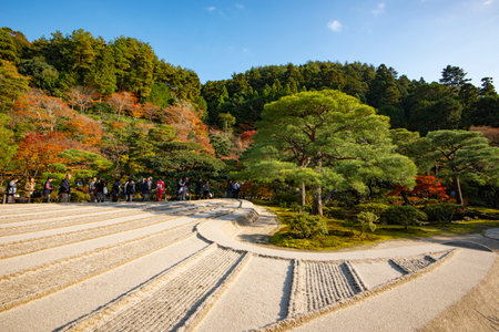 Japan - November 15, 2019 : Colorful maple trees garden blooming vividly in mid November at Ginkakuji Temple, One of most famous tourist destination in Kyoto