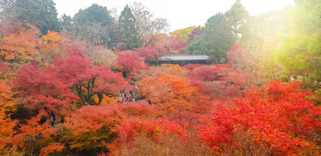 Red maple leaves in autumn garden touching sunlight by Tsutenkyo bridge of Tofuku-ji templ, Kyoto, Japan. Famous travel destination for tourist sightseeing Kansai on peak fall season in December.