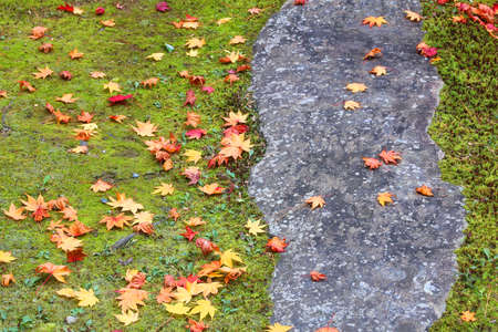 Autumn leaves in Japan - fallen red maple leaves (momiji) in Kyoto. Japanese garden.