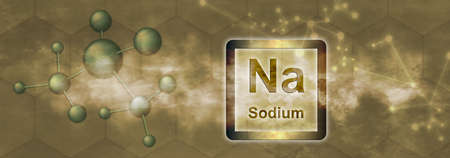 Na symbol. Sodium chemical element with molecule and network on yellow background
