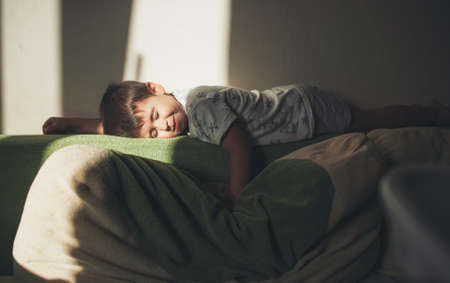 Tired caucasian boy is napping on the couch after playing at home on weekend