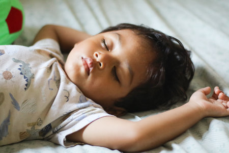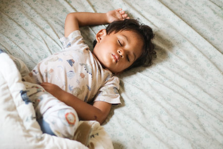 Adorable kid deep sleep in bed in the morning, Child sleeping on bed. Little boy taking a peaceful nap, Children health care concept