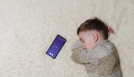 A little boy is sleeping on the sofa on a velvet bedspread next to the phone