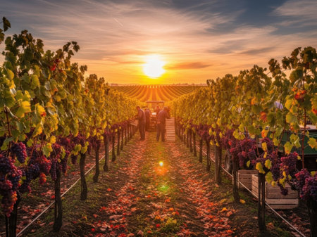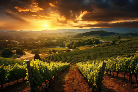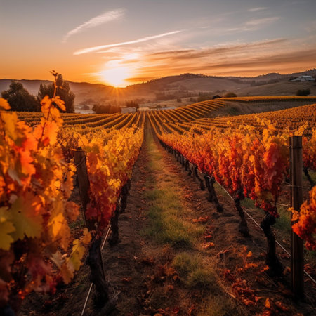 vineyard with rolling hills and autumn sun setting in the background, created with generative ai