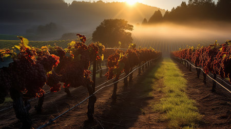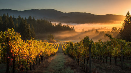 Golden sunlight bathes vineyard rows as soft fog lingers, creating a serene sunrise scene in the wine region.