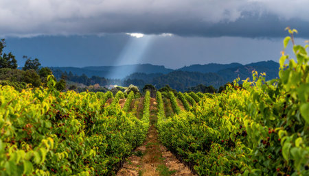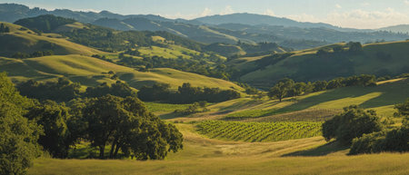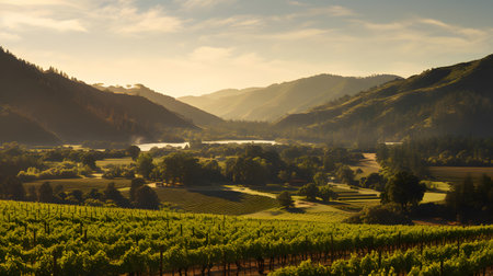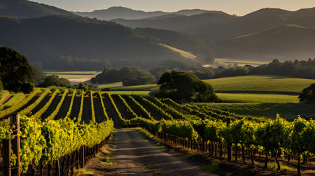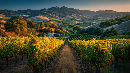 Stunning Vineyard Landscape Rolling Hills Golden Hour Sunlight Agriculture Rural Scenery Farmland