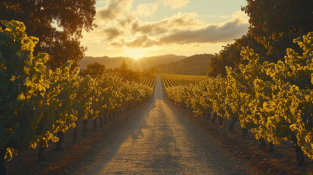 This breathtaking image captures a serene sunset over a lush vineyard, featuring rows of vibrant grapevines and a dusty pathway leading to distant hills.