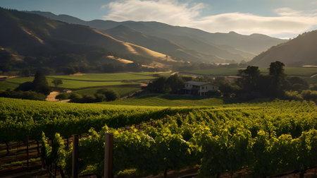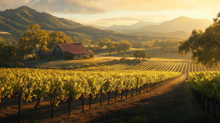 Golden morning sunlight over a farm's vineyard, illuminating the grapevines and casting soft shadows on the rolling hills and rustic farmhouse -