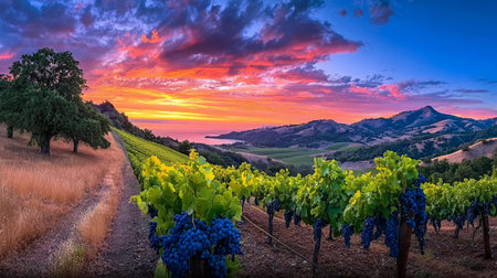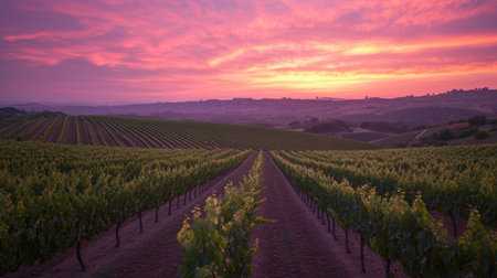 A serene vineyard landscape at sunset with rolling hills and lush green grapevines under a vibrant sky