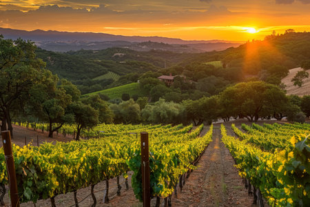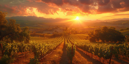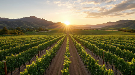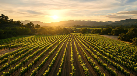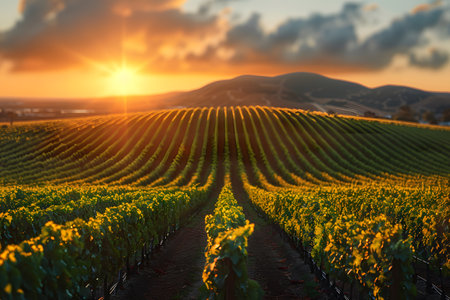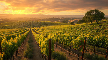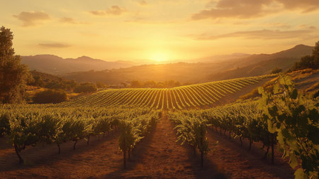 The golden sun dips below the rolling hills, casting a warm, ethereal glow over the perfectly aligned rows of a lush vineyard.