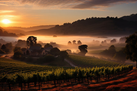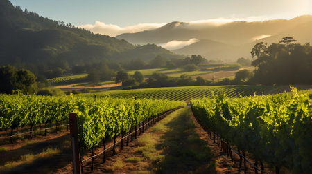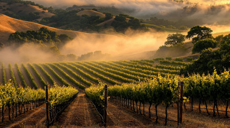 An enchanting vineyard scene captures the beauty of rolling hills and lush vines bathed in soft morning light. Mist adds to the serene atmosphere of the countryside.