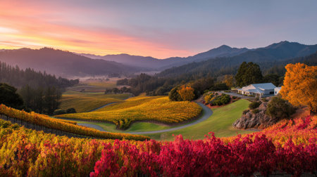 Lush vineyards stretch across hills as the sun sets painting the landscape in warm light.