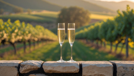 AI Generated. Champagne Flutes on Rustic Stone Wall in Vineyard Landscape During Golden Hour