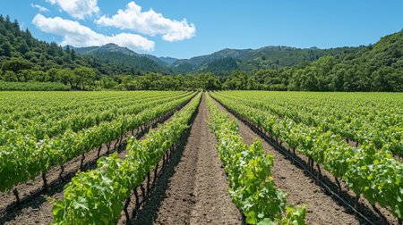 Rows of vibrant green grapevines stretch across the landscape, framed by rolling hills and a clear blue sky, showing the beauty of vineyard cultivation in nature.