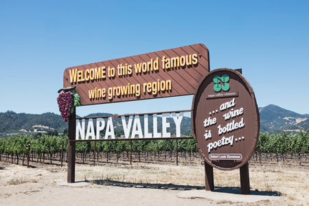 Wooden welcoming sign in Napa valley, famous wine growing region in California, USA