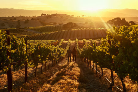 a scenic vineyard at sunset with a couple walking through the rows of grapevines