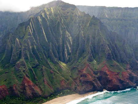 Hawaii Kauai Na Pali coast landscape aerial view from helicopter. Nature coastline dramatic mountains with secluded popular tourist attraction beach. USA destination. High quality photo