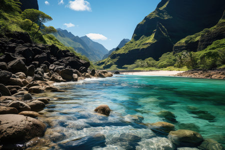 Experience the breathtaking beauty of a coastal landscape with emerald mountains, clear blue ocean waves, and a peaceful beach under a vibrant sky in Hawaii.
