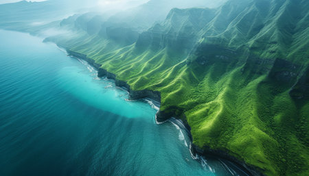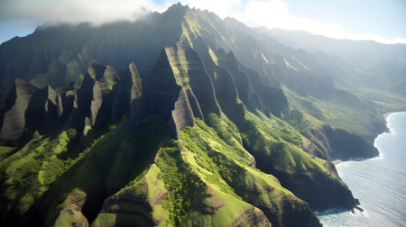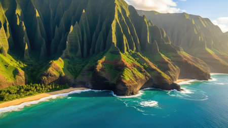 Aerial view of the rugged na pali coast on Kauai Island, Hawaii, showcasing dramatic cliffs, pristine turquoise waters, and a touch of clouds