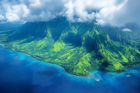 A breathtaking aerial perspective of a lush mountain range meeting a vibrant blue coastline, covered partially by thick clouds. the vivid greenery and dramatic landscape create a stunning contrast against the crystal-clear waters below. Generative AI