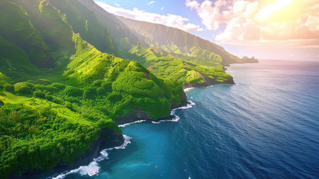 An awe-inspiring aerial perspective of the rugged Na Pali Coast on the island of Kauai, showcasing lush green cliffs meeting the vibrant blue ocean.