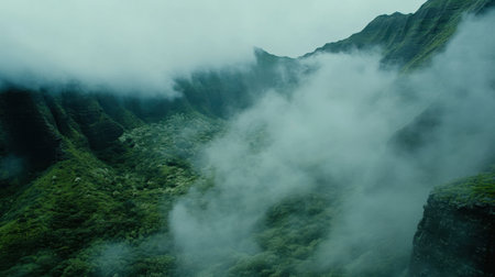 Explore a breathtaking mountain landscape enveloped in mist, showcasing vibrant greenery and dramatic slopes, creating a serene and tranquil atmosphere in nature's embrace.