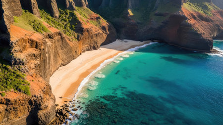 Breathtaking aerial view of the Na Pali Coast State Wilderness Park in Kauai, Hawaii, showcasing the dramatic cliffs, blue ocean, and pristine beach