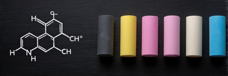 Brightly colored chalk pieces are arranged in a row next to a drawing of a chemical structure, creating an educational and artistic display.