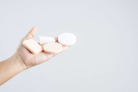 Hand holding face sponge puff for cosmetic on white background
