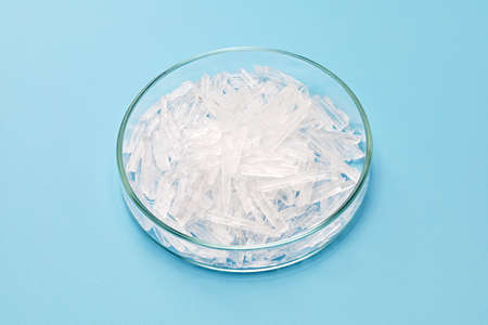 menthol crystals in a petri dish isolated on sky blue background