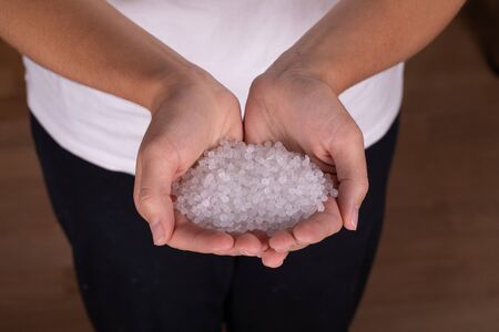 Small Plastic pellets on the finger.Micro plastic. air pollution