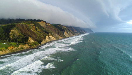 An aerial perspective captures the immense power of nature as a dramatic storm front rolls in over a rugged, cliff-lined coastline. Turbulent waves crash against the shore, creating a scene of wild, untamed beauty and the raw force of the ocean.
