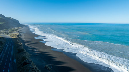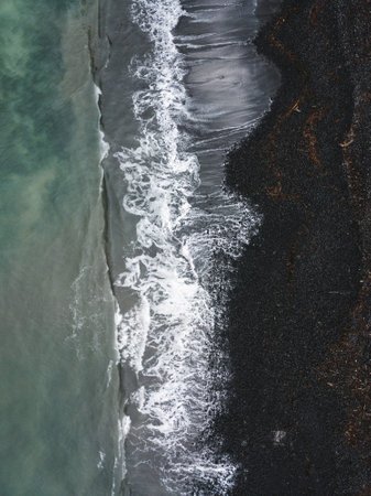 An aerial perspective captures the raw power of ocean waves crashing onto a unique black sand beach, highlighting the stark beauty of the natural coastal landscape.