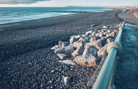 Beautiful calm sea water on a cold winters day. Giant stones are placed as sea defence infrastructure due to rising sea levels and global warming. Pebble beach with mountain backdrop.