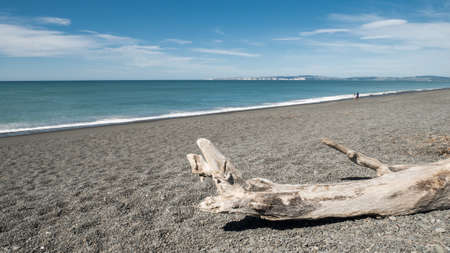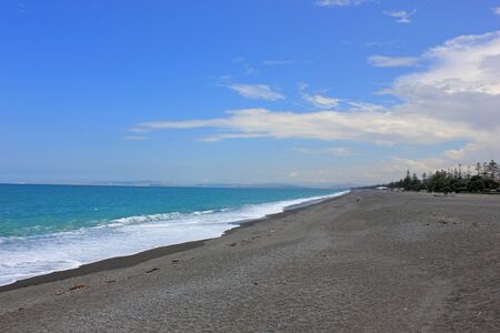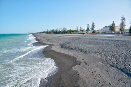 Coastal scenery with calm ocean and beach with blue sky backdrop. Shot at Napier Marine Parade in North Island of New Zealand