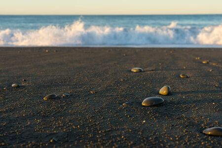 Black stones on the beach at sunset. Beautiful natural background with copy space.