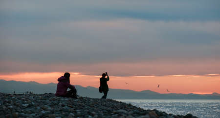 Silhouettes of people taking photos of a beautiful sunset at the coast