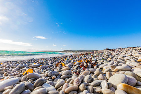 Tranquil coastline landscape with azure sky, sand, rocks, and gentle waves, South Africa